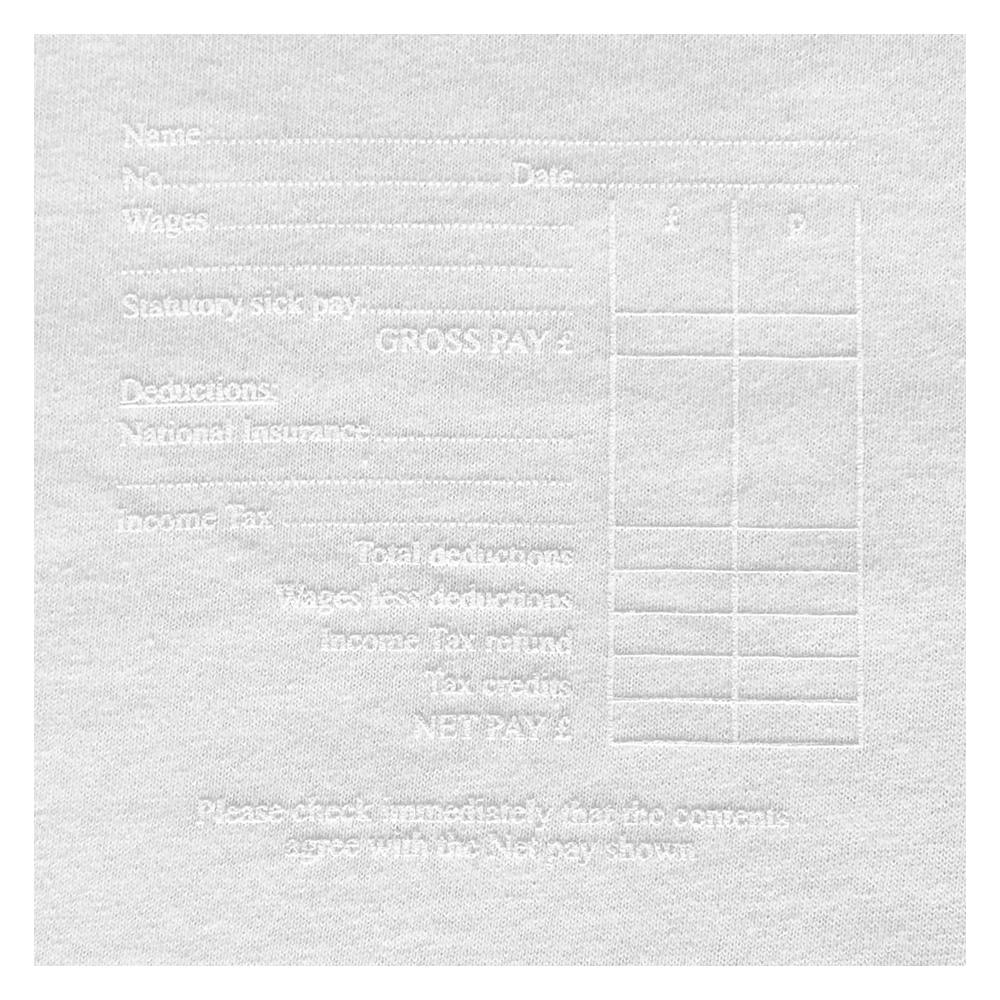 The Wage Packet Tee has been designed by our friend and comrade Mark James. Photographs don’t do it justice as it’s printed white puff ink on white. Believe us when we say it’s a beautiful thing. On sale now from his site.