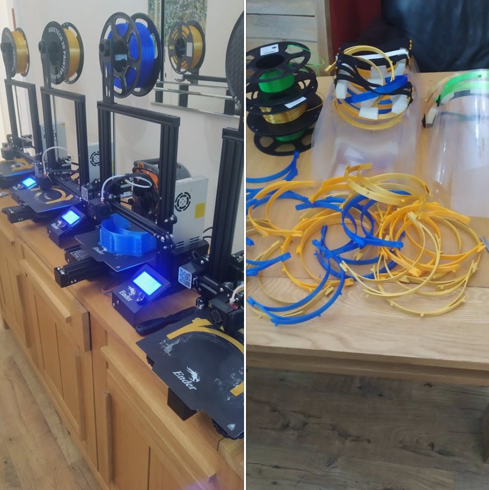 By the time it arrived a few days later there was a bubbling PPE crisis here already. The things we could print that everyone was short of were face shields. A template had been created over a few days by someone at the Czech health ministry, and they’d put it online for anyone to use. Getting going was surprisingly easy… The machine itself looked like a Meccano set when it arrived, but there are YouTubes for everything now and before long it was up, going and printing PPE. By that evening we had a few shields made up using the frames the machine made from the template, laminated A3 sheets, and some elastic and foam. Our local pub, The Volly, has got a WhatsApp group going, so that everyone can stay in touch and pick bits and bobs up for each other, look out for people on their own who are under the 12-week isolation orders, and try to keep each other half sane.
