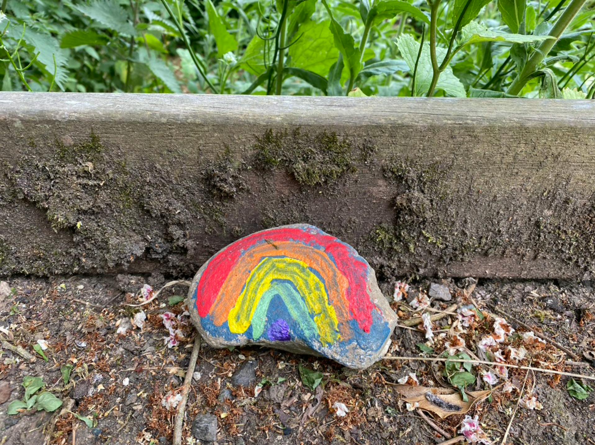 The mown path in front curves left across the meadow into dense green tunnels. Dive into them. Turn right and right again at junctions, disturbing pigeons whose wings shake rain off hawthorn barbs and soak us. Turn right across a brutal bridge, built for horses, where the rainbow stone was left and stolen. An old zinc watering can hides behind a lilac hedge whispering to its self. A builder’s boom box works in the rain, dodging squalls to chip away and remain employed.