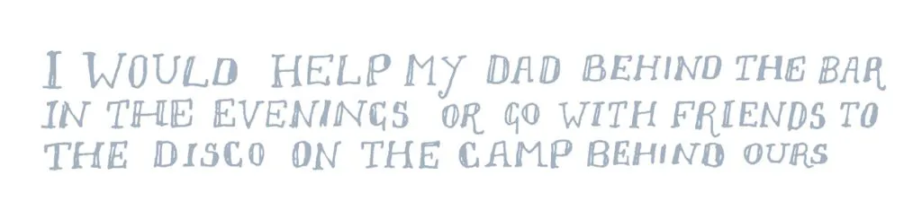 The first song I ever remember hearing at the Camp was ‘In a Big country’ by the 80’s pop rock band Big Country. It’s totally cheesy but honestly when I hear it – it’s the first song that I remember hearing at the camp – it makes me feel now just as it did then, that a big exciting adventure was beginning – that things were really going to be alright after all. It is sunny, I’m standing in the bar with my dad, my cousins are running around, my grandparents are busy organising the shop, the grown ups are chatting. Everyone is there, I feel safe, and the lights have properly come on again after a year of utter darkness. It still makes me feel just as it did then – pure and radiating happiness…