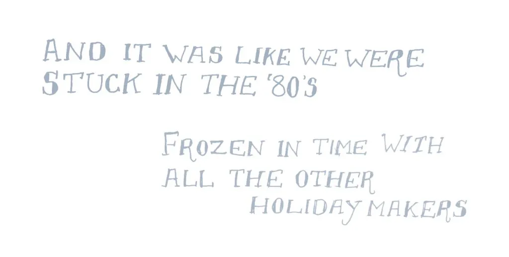 Another well worn song on the juke box was The Cure’s ‘Boys Don’t Cry’ which was my cousin David’s favourite when we were teenagers. Every time I hear this I am immediately transported to warm evenings in the bar after a happy day at the beach, feeling the warmth on my cheeks, the buzz in the bar, my family altogether, my dad serving drinks having a laugh with the customers, playing on the steps outside with my brother and cousins and any new friends we had made. I was so happy here.