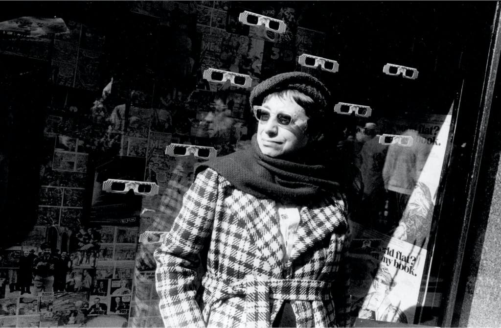 I know these crossroads that backdrop Godlis’ photos, pleased to recognize landmarks no longer there, caught by the shutter as it opens and comes down like a curtain, an eye’s blink. There’s that pizza place I used to frequent on Third Avenue; the St. Mark’s Theater with a Jim Jarmusch film on the marquee; 42nd Street when it was all triple-X. No longer there, but I walked past these scenarios once, and now again, the frozen moment.
