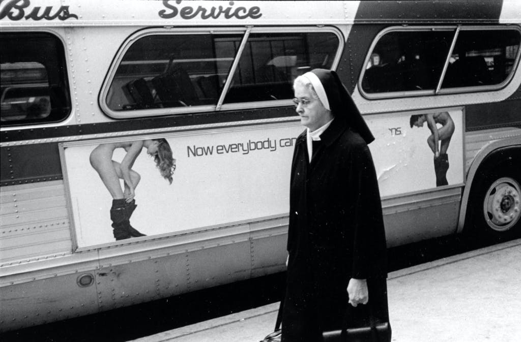 He knows how to juxta-pose. A fur-coated matron beneath a sign advertising “Heavenly Coffee.” The preacher by the Times Square subway station where an airline advertisement says “Save As You Go.” Sometimes there’s a punchline – the nun walking past a bus where a nude-from-the-waist-down model is pulling on a pair of designer jeans – and sometimes there’s just streetscape, the random people strolling past you, each with their own tale, the life they’ve living written on their faces and body language and clothes they’re wearing. Most aren’t smiling.
