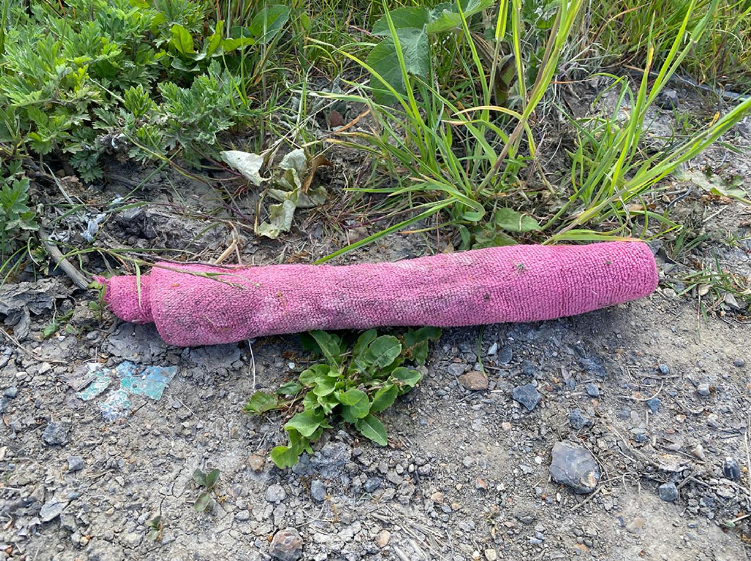 A dirty pink toweling sausage lies on bare earth where cars pull in and park.