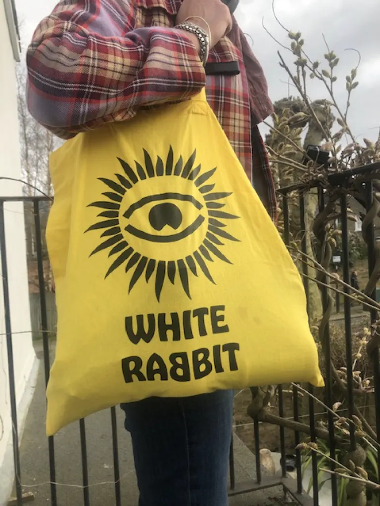 As well as my headphones, I pick up my sun-bright yellow White Rabbit tote bag with its psychedelic eye emblazoned on the side and roll it up into my jacket pocket, or tuck it into the back of my jeans like a gun. At first this was a practical measure in case I came across a shop without a queue, but now the bag has become my talisman, my amulet, I can’t leave the house without it. My headphones, my White Rabbit bag, they are my mask and gloves.
